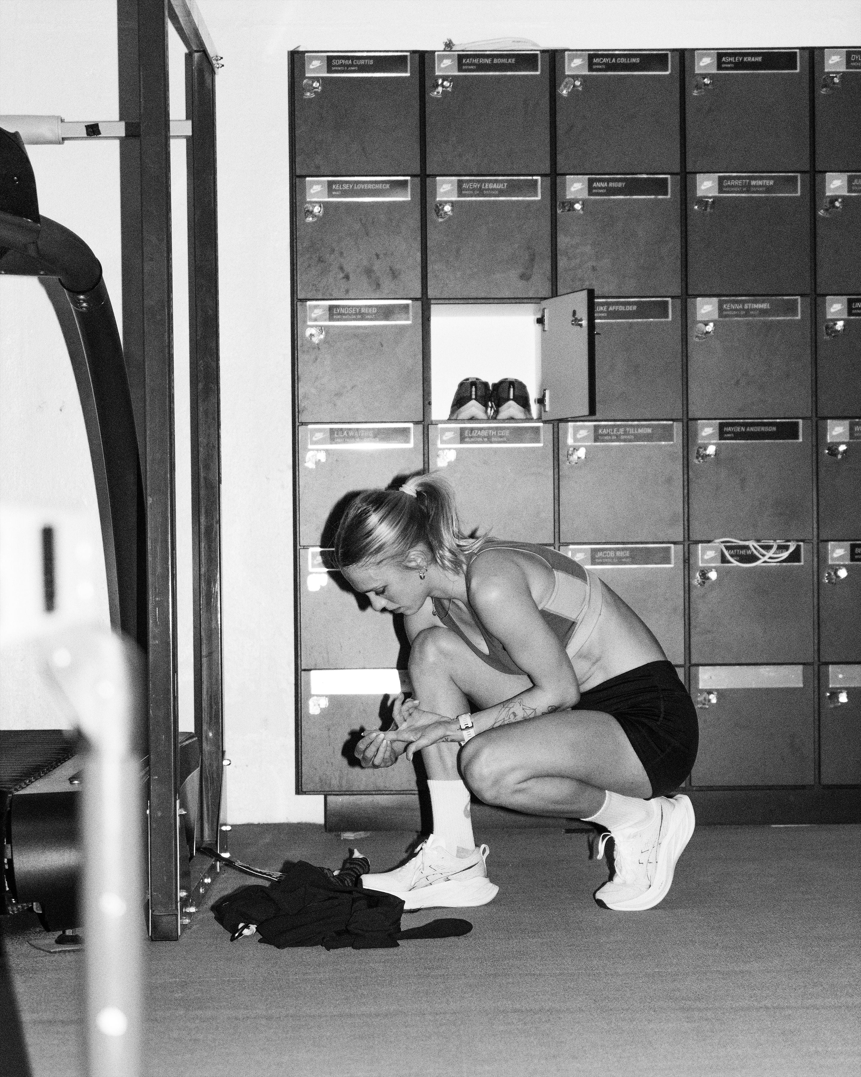 A stretch rope, an elastic workout band, headphones, extra socks, gloves, chapstick, Cadence electrolyte packets, trainers, sunglasses and my spikes.